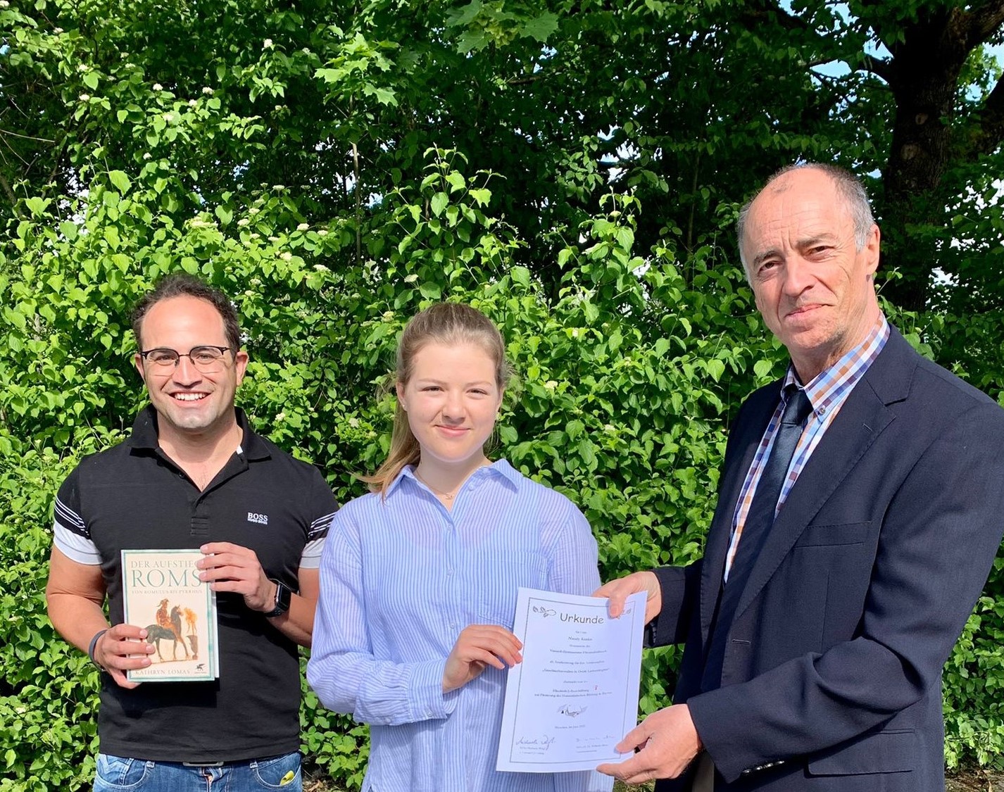 Nataly erhielt für ihre hervorragende Leistung aus den Händen unseres Schulleiters Herrn Zellmeier, der sie zu ihrem großen Erfolg beglückwünschte, neben einer Urkunde ein wertvolles Buchgeschenk sowie einen Geldpreis.