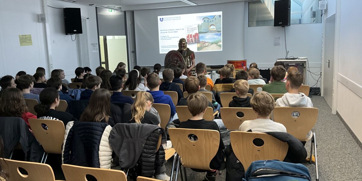 Woher stammt eigentlich der Name Augsburg? Weshalb kreisen Drohnen mit moderner Lasertechnologie über Schöngeising? Und weshalb lohnt sich ein Ausflug nach Oberammergau? Antworten auf diese und weitere spannende Fragen erhielt die 6. Jahrgangsstufe vom Archäologen Herrn Dr. Wolfgang Thiel, der dem Viscardi-Gymnasium am 4. April einen Besuch abstattete und in einem fesselnden Vortrag und einer reich bebilderten Präsentation die römische Herrschaft über