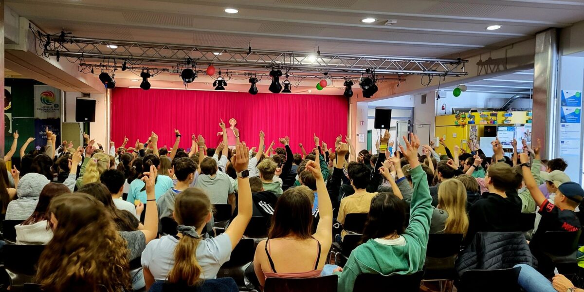 Eine Runde Schafkopfen, am Tisch mit „Juppi“ (alias Jupiter), Julius Cäsar und Jesus? Das durften alle Lateinschülerinnen und -schüler des Viscardi-Gymnasiums am vergangenen Mittwoch in unserer Aula erleben. Der Kabarettist und Bühnenlateiner Björn Puscha nahm sie in seinem Programm „Schlechte Karten für Jupiter“ mit auf eine Phantasiereise ins Alte Rom, wo das alltägliche Leben in der Stadt, ein Wagenrennen im