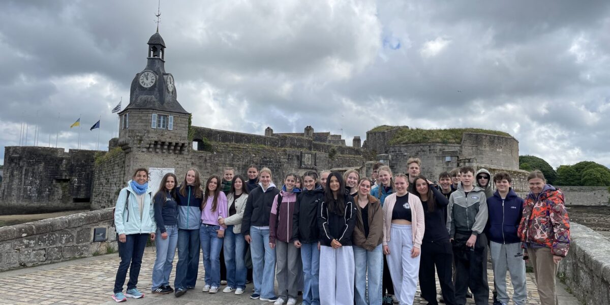 Am 12.05.25 ging unsere große Austauschfahrt los nach Concarneau im französischen Département Finistère (von Lateinisch finis terrae: das Ende der Welt). Trotz der weiten Anreise von fast 17 Stunden Busfahrt stiegen wir alle bestens gelaunt und sichtlich aufgeregt auf dem Schulhof unserer französischen Partnerschule Ensemble scolaire Saint-Joseph et Saint-Marc aus. Welch‘ freudiges Wiedersehen! Die französischen Schüler hatten uns bereits im