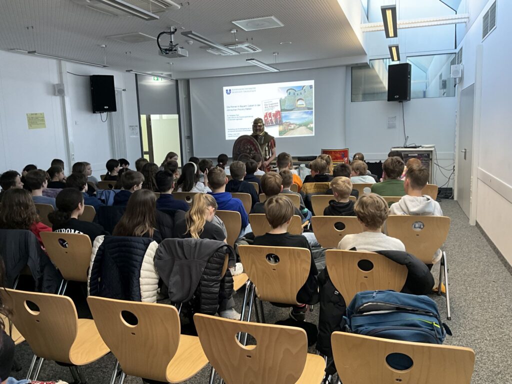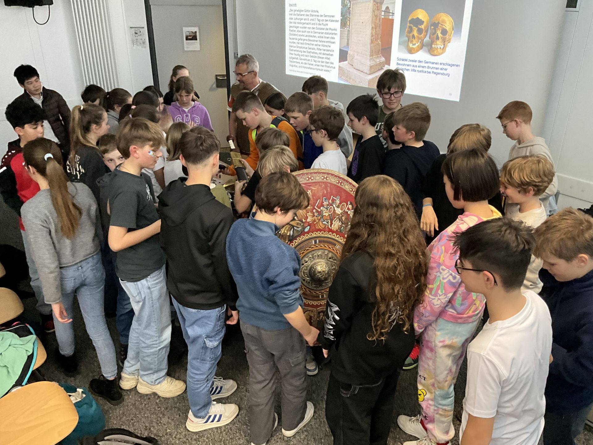 Antworten auf diese und weitere spannende Fragen erhielt die 6. Jahrgangsstufe vom Archäologen Herrn Dr. Wolfgang Thiel, der dem Viscardi-Gymnasium am 4. April einen Besuch abstattete und in einem fesselnden Vortrag und einer reich bebilderten Präsentation die römische Herrschaft über das heutige Bayern wieder aufleben ließ. Darüber hinaus konnten die Kinder römische Alltagsgegenstände und Militaria im Original oder als Rekonstruktion untersuchen und so eine prägende Epoche in der Geschichte des heutigen Bayerns hautnah miterleben.