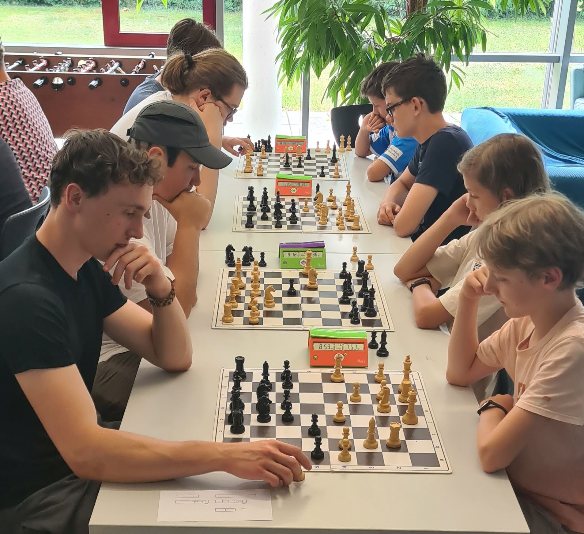 Am vergangenen Freitag, den 04. Juli, fand in der Mensa des Viscardi-Gymnasiums ein Schnellschachturnier in der inzwischen dritten Auflage statt. Dabei spielen jeweils Vierermannschaften bei einer Bedenkzeit von jeweils 10 Minuten gegeneinander. Das Besondere dabei ist, dass nicht nur aktuelle Schülerinnen und Schüler der Wahlkurse Schach daran teilnehmen, sondern auch ehemalige Schüler, Eltern und Lehrer Mannschaften stellen können.